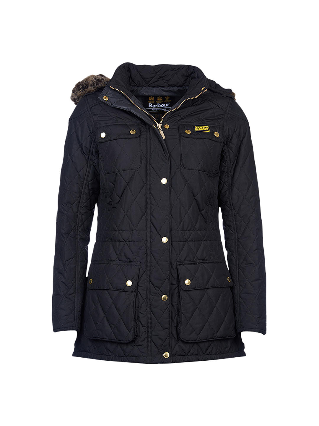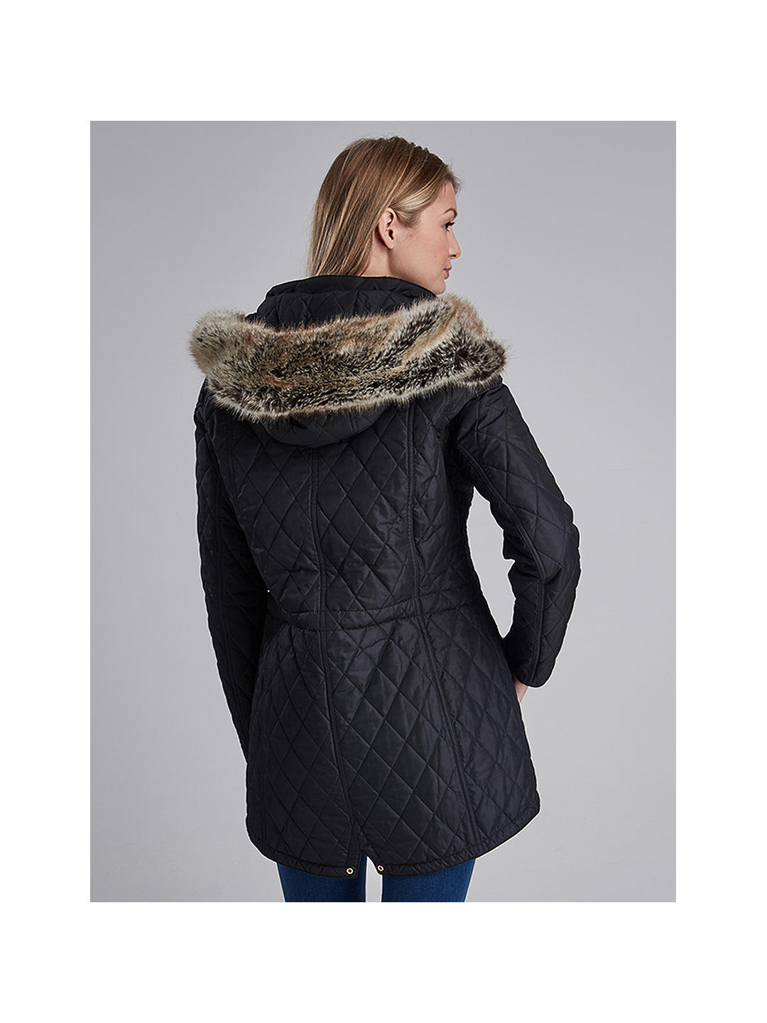 Carefully made from a super soft fabrication, this diagonal quilted design features long sleeves with elasticated cuffs, a concealed zip fastening with press stud closure, 4 front flap pockets, a gently fitted waistline for a sleek silhouette, a large detachable hood with faux fur trim and iconic Barbour branding in appliqué at the left chest.