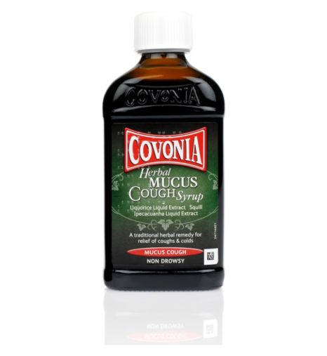 Covonia Herbal Mucus Cough Syrup contains extracts of liquorice, ipecacuanha and squill which belong to a group of medicines known as expectorants. They help remove phlegm in people with chesty coughs and colds.