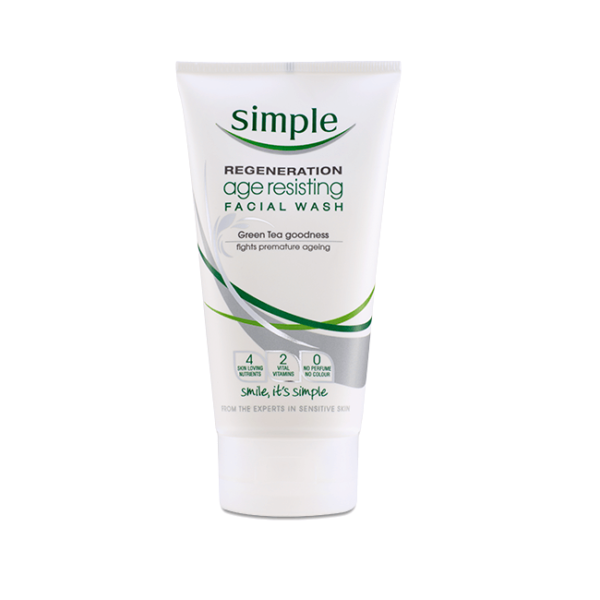- Help to fight the signs of premature ageing from the very start of your beauty routine with the Simple Regeneration Age Resisting Facial Wash and foaming cleanser! Choosing the right products for your skin is a great step on the road to maintaining that youthful glow; with our special blend of Simple cleansing goodness, featuring ingredients like Pro-Vitamin B5, Vitamin E, Mushroom Extract, Oat-Beta Glucan, Chamomile and Green Tea Extracts, our Age Resisting Facial Wash helps to moisturise, tone and gently cleanse the skin. This hardworking beauty essential not only removes impurities, but leaves your complexion visibly clearer too. It is the ideal first step in your Simple Regeneration skincare regime, helping to refresh skin whilst also preparing it for your moisturiser, creating that perfect base for your make-up.